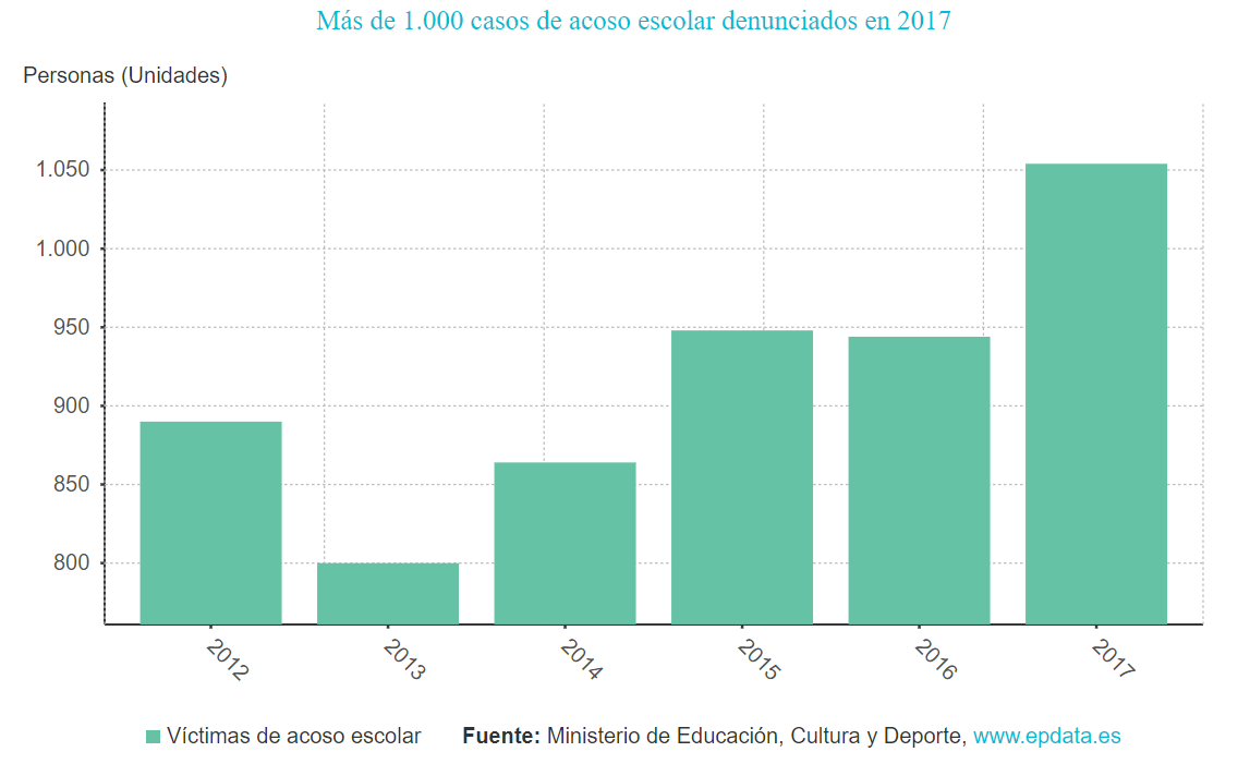 El siguiente gráfico muestra el número de denuncias por acoso escolar según la estadística oficial.