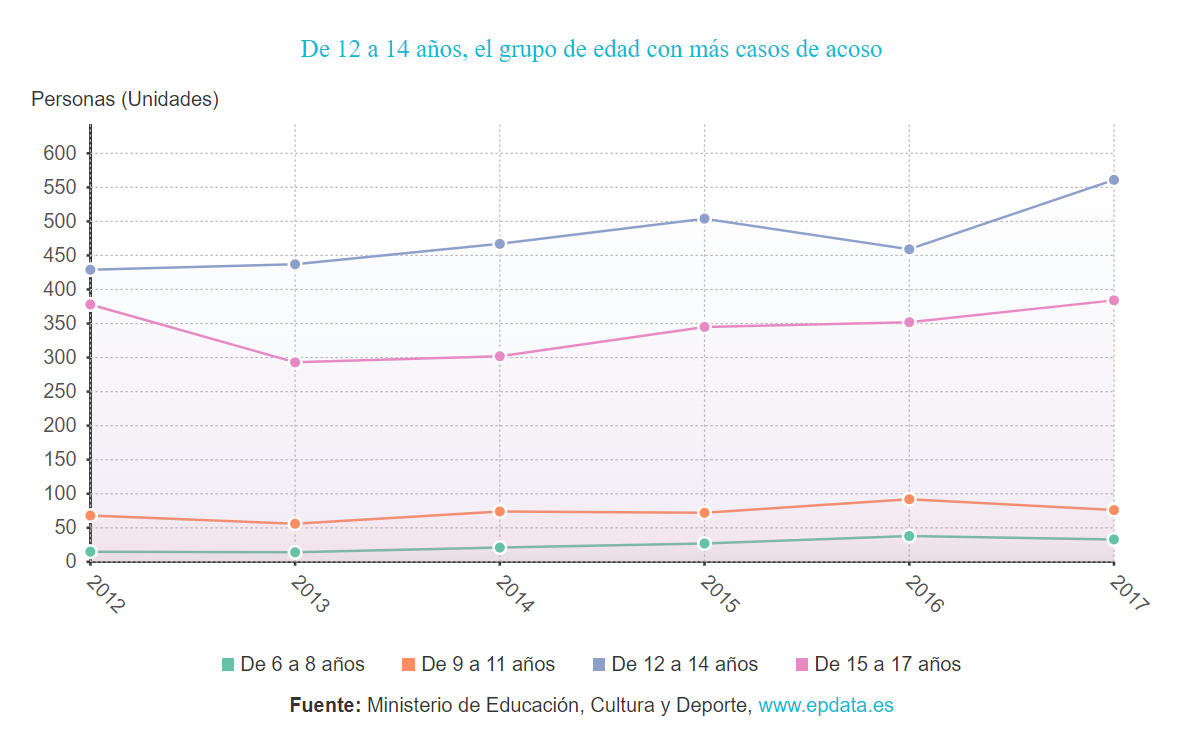*Como bien se aprecia en este gráfico, el grupo de edad de 12 a 14 años es en el que se presenta un mayor número de casos; entre 2012 y 2014 el número de casos se mantuvo bastante estable, es a partir del año 2014 cuando el número de casos empieza a variar, llegando a sumar un total de 550 en 2017. El grupo de edad de entre los 6 y los 8 años, apenas presenta casos de acoso y se mantiene bastante estable con el paso de los años. Entre los otros dos grupos de edades podemos apreciar también una diferencia significativa en el número de casos, siendo mayor en niños de 15 a 17 años que en niños de 9 a 11 años.
