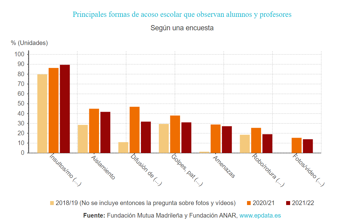 *Como podemos observar en este gráfico, la forma de acoso escolar más frecuente es la verbal, lo que engloba insultos, burlas, difamaciones... llegando a sumar el 90% entre los años 2021 y 2022, aunque es cierto que no hay diferencias significativas con respecto a los dos años anteriores. Por otro lado, la forma de acoso menos frecuente es a a través de la difusión de fotos y vídeos, no llegando siquiera al 20%.